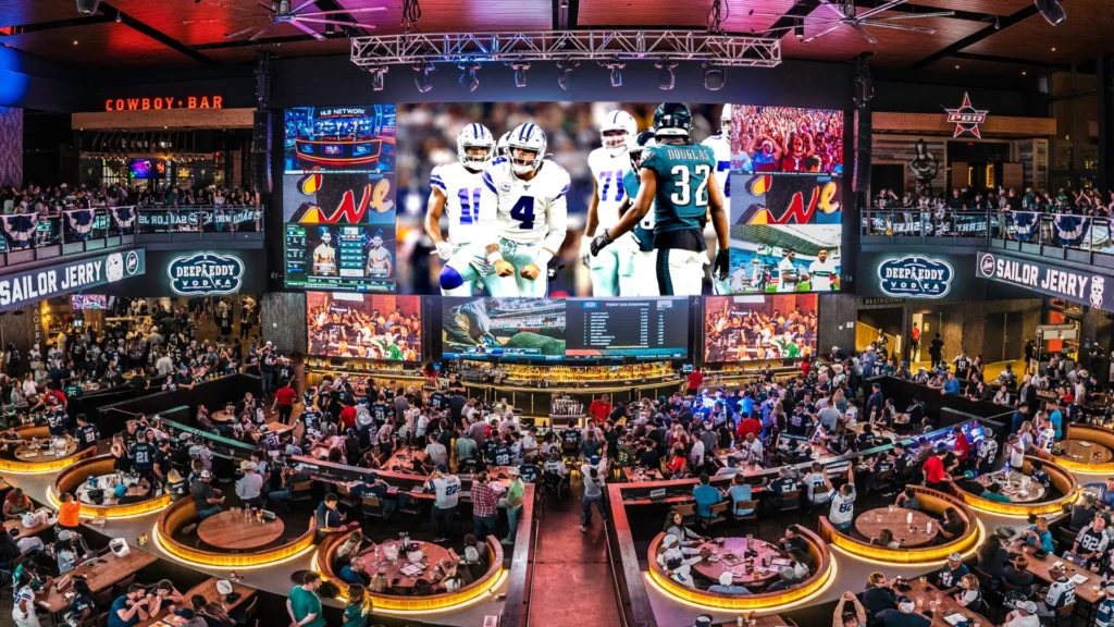 A massive dining and sports hub next to the stadiums in Arlington. Watch parties, concerts, and big screens everywhere.
